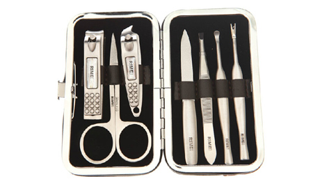 包裝規(guī)格:110mm*67mm*25mm 單套重量:133.2g 材質(zhì):PU+430不銹鋼 配件:RMT625E指甲鉗、美容剪、斜口指甲鉗、指甲銼、耳挖、死皮刀、眉夾